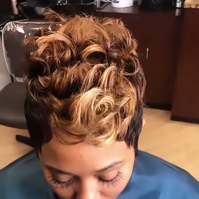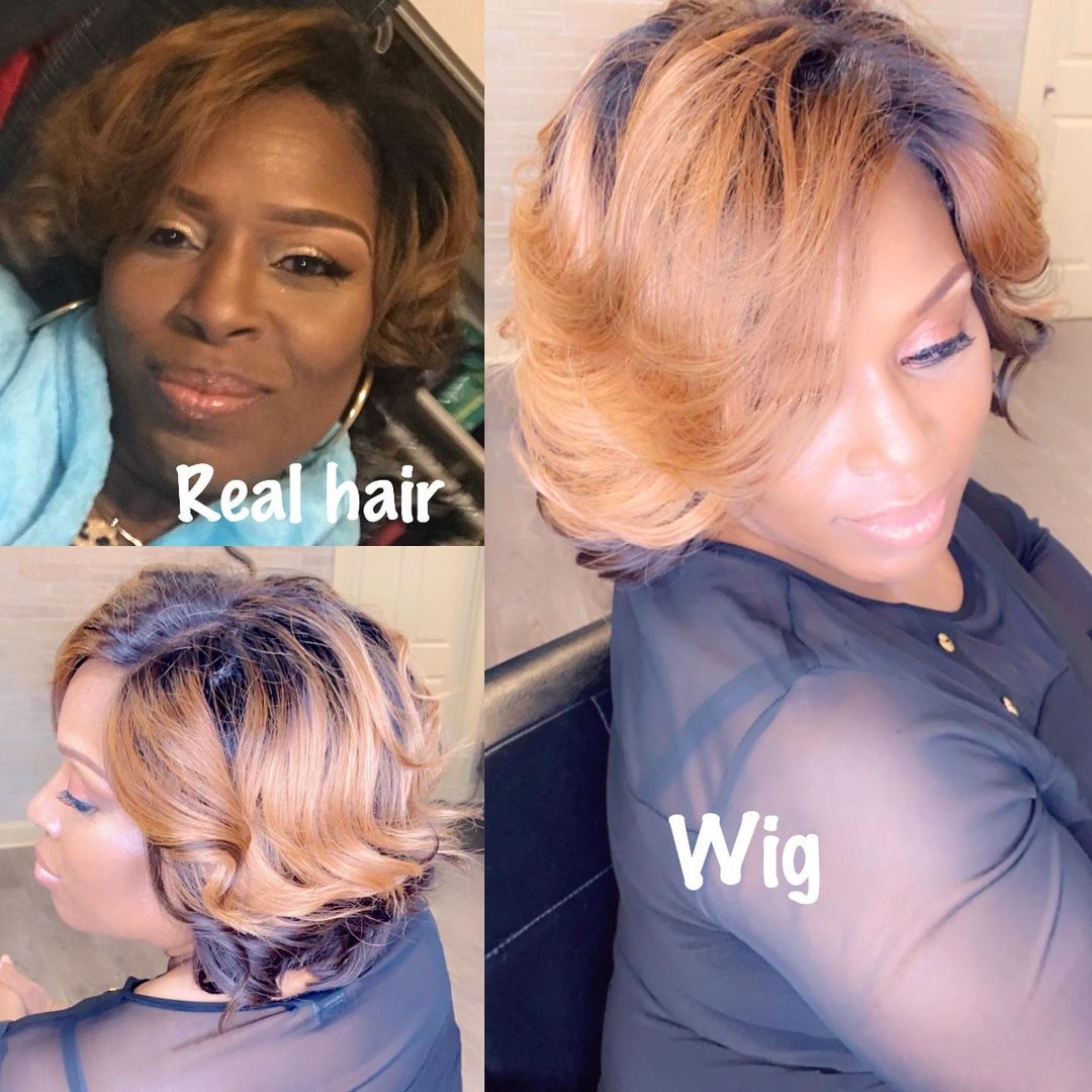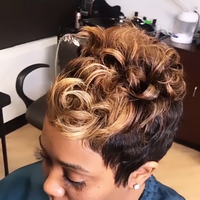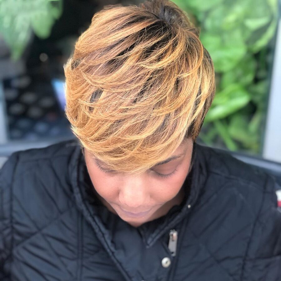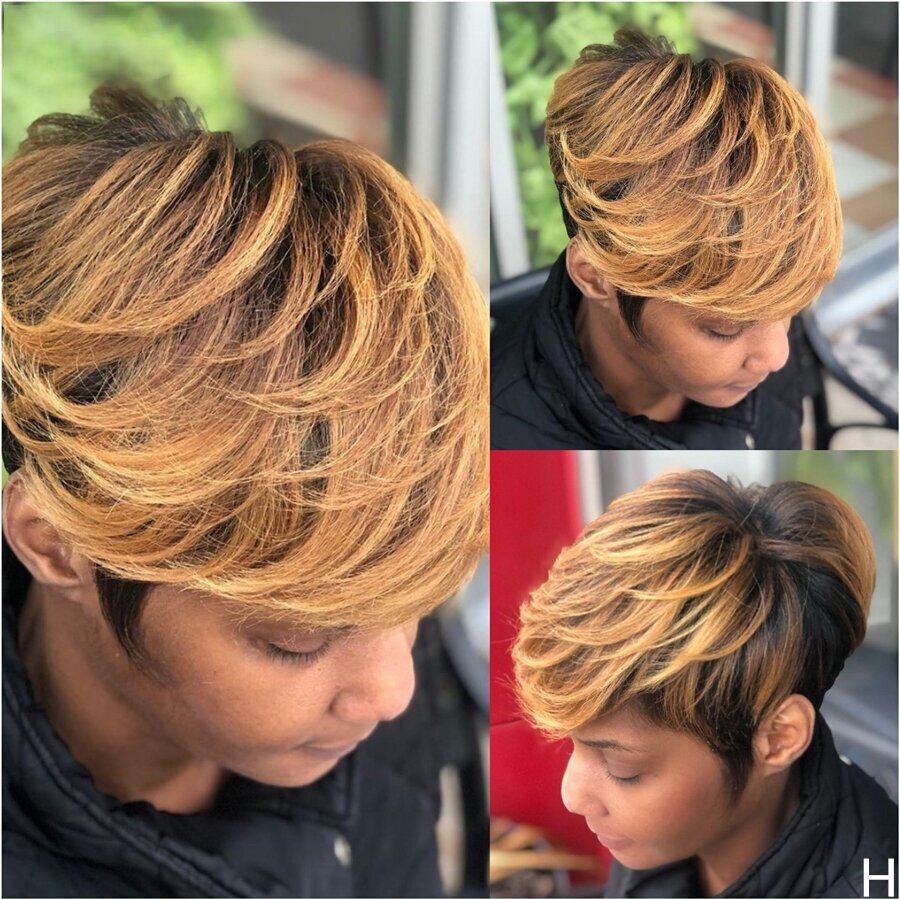 Hot SaleBlack Mix Gold Short Wavy Bob Pixie Cut With Bangs